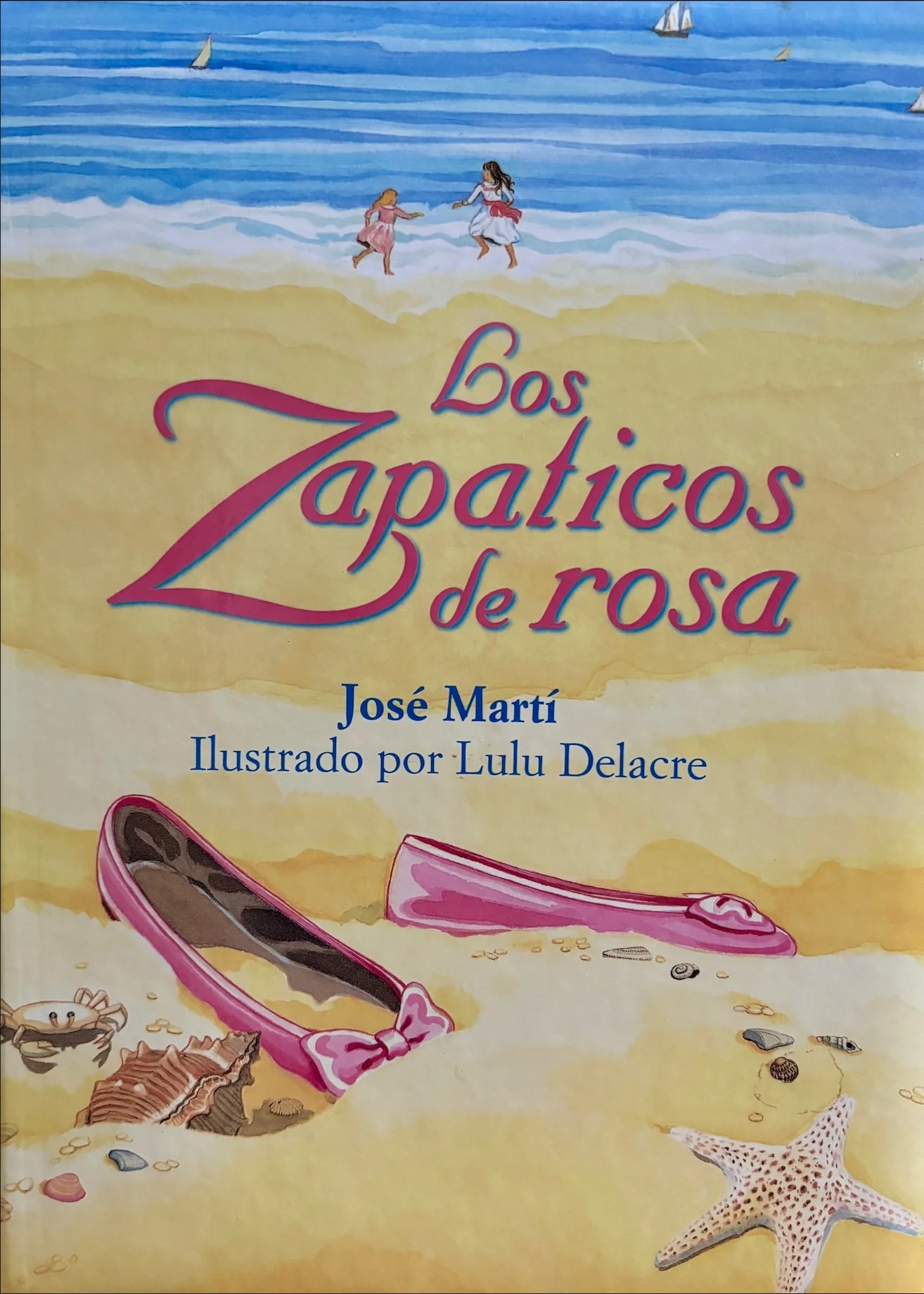 Los zapaticos de rosa is a lovely children’s story in verse about a rich little girl named Pilar who goes to the beach with her mom one day. When she wants to go off to play, her mom warns her not to get her new pink slippers wet. Well — wouldn’t you know it? — Pilar returns a while later, completely barefoot, no pink slippers in sight. When her mom starts scolding her, a poor woman intervenes, explaining that Pilar had seen her sick daughter’s bare feet and given her the slippers. Pilar’s mother is so moved by the woman’s story and by Pilar’s act of kindness that she gives her more stuff: a shawl, a ring, a flower, and a kiss.